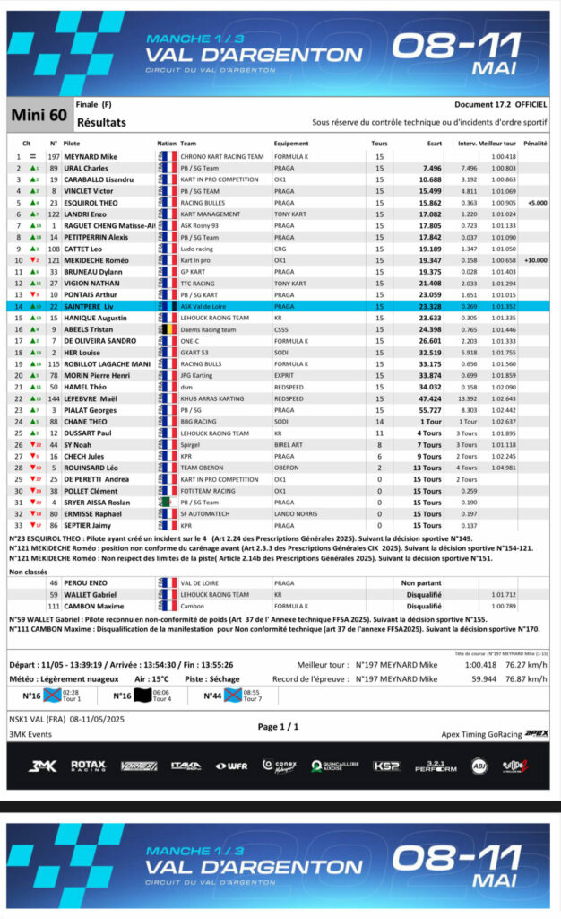 Résultat, je suis religuée à la 33ème place sur la grille pour la finale.